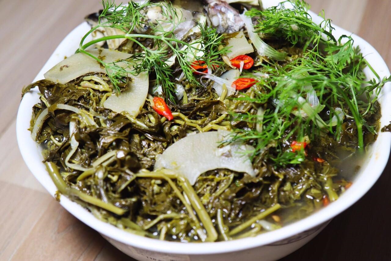 Rau sắn là phần lá non của cây sắn. Sau khi hái, lá được vò kỹ rồi muối chua. Chính quá trình muối đã tạo nên vị chua thanh tự nhiên, khi nấu canh hoặc kho cùng cá, thịt sẽ dậy mùi thơm hấp dẫn. Món canh rau sắn muối chua ăn cùng cơm nóng hay bát cá kho đều mang lại sự ngon miệng, dân dã mà khó quên.