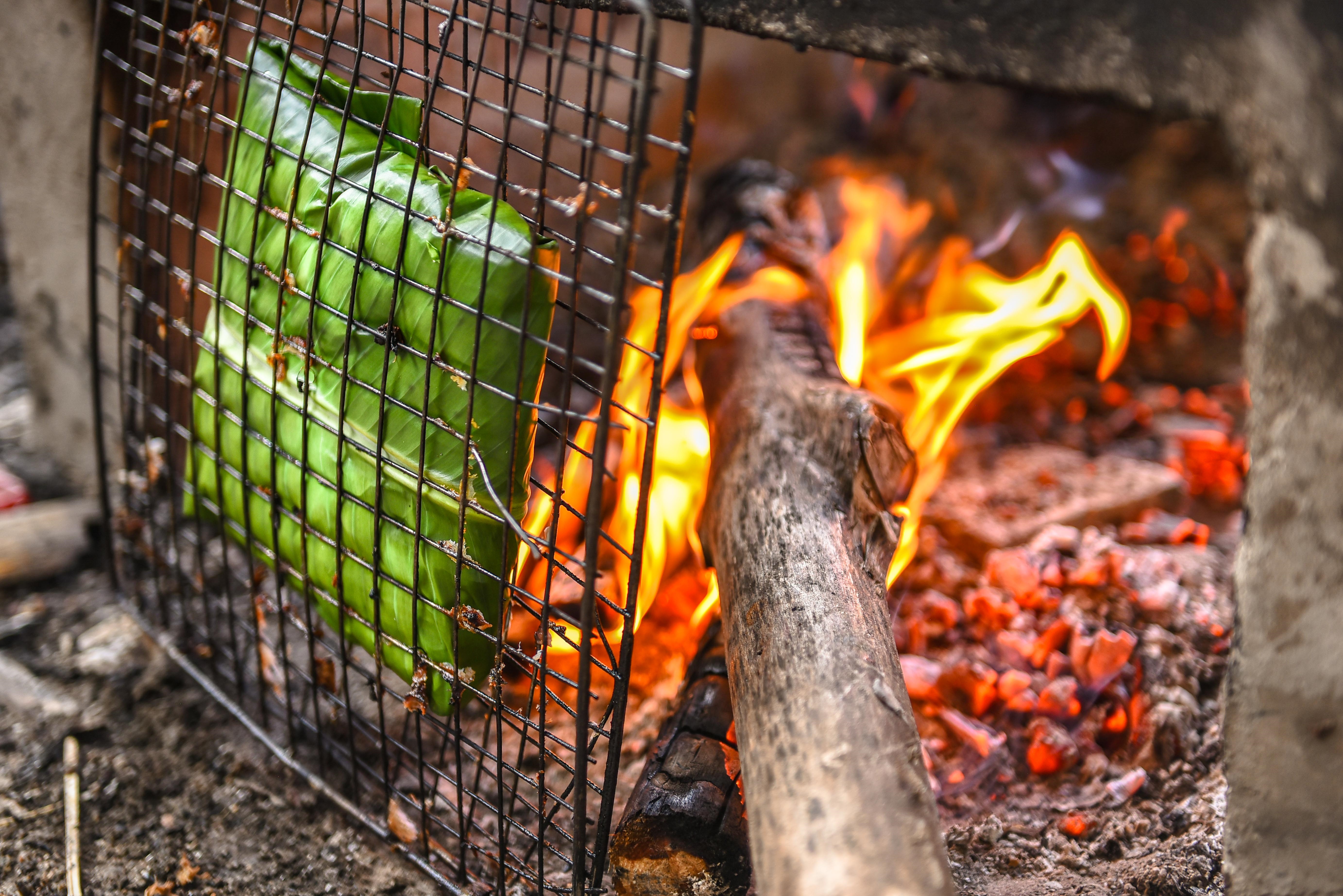 Rêu đá mọc tự nhiên trên các phiến đá ven suối, được coi như một loại “rau sạch” của núi rừng. Sau khi hái về, rêu được rửa sạch, bóp kỹ cho hết nhớt, rồi trộn với muối, ớt, mắc khén, hành tỏi. Hỗn hợp rêu sau đó được gói trong lá chuối, nướng trên than hồng cho đến khi tỏa mùi thơm đặc trưng.
