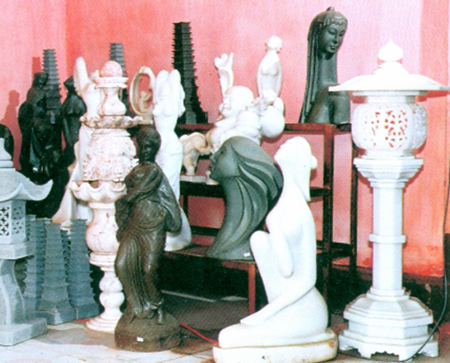 Là một làng nghề tồn tại hàng trăm năm nay ở xã miền núi Hải Lựu – Sông Lô. Để sản xuất ra những sản phẩm từ đá những người thợ đá phải lên tận đồng Trổ đồng Trăm của núi Thét mới lấy được những thớ đá không bị ròn, màu sắc đẹp để chế tác ra sản phẩm. Bằng những công cụ thô sơ như chòng, búa, com ba, đục và với tâm huyết của người thợ, những phiến đá thô giáp sần sùi chỉ qua vài nét chạm trổ, đục đã trở thành những vật dụng có ích phục vụ đời sống.